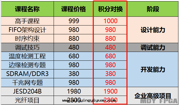 1積分(fēn)=1元(yuán).可(kě)以(yǐ)兌換FPGA專題(tí)課(例如(rú):拿到(dào)1000積分(fēn),課程售價999元(yuán),可(kě)以(yǐ)免費兌換一(yī)个(gè)高(gāo)手(shǒu)課程啦!課程詳情(qíng)兌換如(rú)图(tú):)