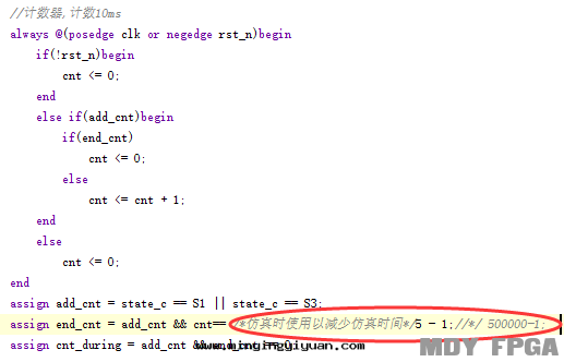 //計(jì)數器,計(jì)數10ms always @(posedge clk or negedge rst_n)begin if(!rst_n)begin cnt <= 0; end else if(add_cnt)begin if(end_cnt) cnt <= 0; else cnt <= cnt + 1; end else cnt <= 0; end assign add_cnt = state_c == S1 || state_c == S3; assign end_cnt = add_cnt && cnt== /*仿真(zhēn)时(shí)使用(yòng)以(yǐ)減少(shǎo)仿真(zhēn)时(shí)間(jiān)5 - 1;*/ 500000-1; assign cnt_during = add_cnt && end_cnt == 0;