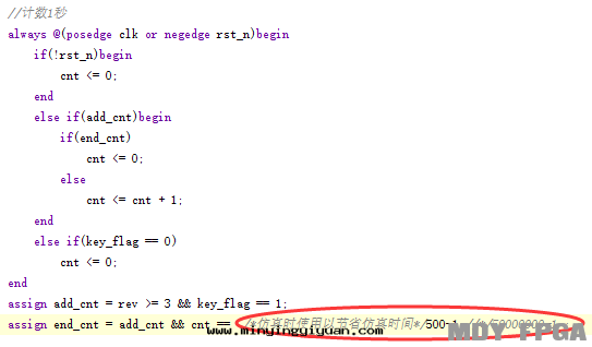 //計(jì)數1秒(miǎo) always @(posedge clk or negedge rst_n)begin if(!rst_n)begin cnt <= 0; end else if(add_cnt)begin if(end_cnt) cnt <= 0; else cnt <= cnt + 1; end else if(key_flag == 0) cnt <= 0; end assign add_cnt = rev >= 3 && key_flag == 1; assign end_cnt = add_cnt && cnt == /*仿真(zhēn)时(shí)使用(yòng)以(yǐ)节(jié)省(shěng)仿真(zhēn)时(shí)間(jiān)500-1;*/50000000-1 ;
