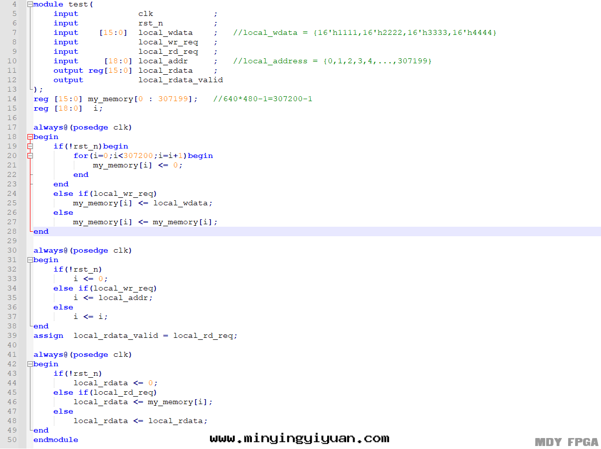 【問(wèn)題(tí)6.8】請問(wèn)在(zài)邊(biān)緣檢测模块(kuài)中(zhōng)的(de)vga_config模块(kuài),如(rú)果(guǒ)想(xiǎng)顯示完整的(de)一(yī)幀图(tú)像(假設为(wèi)彩条(tiáo)顯示)而(ér)ram資源不(bù)够,我(wǒ)用(yòng)的(de)多(duō)維數組来(lái)做存儲器存儲16bit 640*480个(gè)像素點(diǎn),(目的(de):在(zài)local_wr_req时(shí)将写數據(jù)按地(dì)址存進(jìn)去(qù),在(zài)local_rd_req时(shí)将數據(jù)按地(dì)址读(dú)出(chū)来(lái)),請問(wèn)以(yǐ)下(xià)代(dài)碼方(fāng)案(àn)是(shì)否可(kě)行,若不(bù)行,請問(wèn)該如(rú)何实現(xiàn)此(cǐ)目的(de)?(代(dài)碼如(rú)下(xià)图(tú)示)
