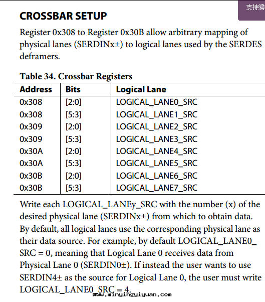 首先(xiān),明(míng)确概念,SERDIN0~7指的(de)是(shì)AD9144芯片(piàn)上(shàng)定(dìng)義的(de)管(guǎn)脚,是(shì)物(wù)理的(de),可(kě)以(yǐ)去(qù)看(kàn)管(guǎn)脚图(tú)。LANE0~7,是(shì)指內(nèi)部(bù)表(biǎo)示的(de)LANE編号(hào)。 估計(jì)是(shì)为(wèi)了(le)靈活性(xìng),LANE0~7不(bù)是(shì)與(yǔ)SDRDIN0~7不(bù)是(shì)一(yī)个(gè)一(yī)个(gè)对(duì)應(yìng)的(de),其对(duì)應(yìng)關(guān)系(xì)是(shì)可(kě)以(yǐ)配置的(de),上(shàng)面(miàn)幾(jǐ)个(gè)寄存器就(jiù)是(shì)起这(zhè)種(zhǒng)作用(yòng)。 例如(rú),LANE0可(kě)以(yǐ)與(yǔ)SERDIN0对(duì)應(yìng),这(zhè)个(gè)时(shí)候的(de)0X308[2:0]=0,也(yě)可(kě)以(yǐ)和(hé)SERDIN4对(duì)應(yìng)起来(lái),这(zhè)个(gè)时(shí)候0X308[2:0]=4。 其次(cì),理解(jiě)了(le)上(shàng)面(miàn)關(guān)系(xì)後(hòu)。你可(kě)以(yǐ)根(gēn)據(jù)实際情(qíng)況来(lái)配置,例如(rú),本(běn)案(àn)例中(zhōng)的(de)AD9144子板,它(tā)的(de)SERDIN0~3是(shì)沒(méi)有(yǒu)用(yòng)的(de),只(zhī)使用(yòng)了(le)SERDIN4~7,这(zhè)是(shì) 固定(dìng)死的(de)。然後(hòu)內(nèi)部(bù)的(de)配置,您可(kě)以(yǐ)使用(yòng)LANE4~7来(lái)对(duì)應(yìng)SERDIN4~7,也(yě)可(kě)以(yǐ)使用(yòng)LANE0~3来(lái)对(duì)應(yìng)SERDIN4~7,这(zhè)由(yóu)您来(lái)決定(dìng),都是(shì)可(kě)以(yǐ)实現(xiàn)的(de)。 最(zuì)後(hòu),再強(qiáng)調一(yī)下(xià)工程思(sī)維:芯片(piàn)提(tí)供了(le)很多(duō)功能(néng),您用(yòng)也(yě)可(kě)以(yǐ),不(bù)用(yòng)也(yě)可(kě)以(yǐ),您会(huì)怎麼(me)做?你就(jiù)選擇最(zuì)簡單的(de)来(lái)做,甚至(zhì)就(jiù)是(shì)忽視它(tā)存在(zài),也(yě)就(jiù)是(shì)使用(yòng)默認值。