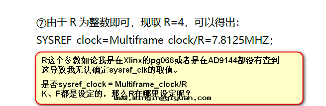 答(dá):可(kě)以(yǐ)認为(wèi)是(shì)AD9516給(gěi)FPGA的(de)一(yī)个(gè)多(duō)幀时(shí)鐘(zhōng),用(yòng)于(yú)同(tóng)步多(duō)幀的(de),可(kě)以(yǐ)認为(wèi)D个(gè)多(duō)幀就(jiù)發(fà)一(yī)个(gè)上(shàng)升(shēng)沿,这(zhè)樣(yàng)就(jiù)好(hǎo)同(tóng)步了(le)。具體(tǐ)有(yǒu)一(yī)个(gè)視頻,可(kě)以(yǐ)看(kàn)JESD204B協議04_实踐_協議各(gè)个(gè)时(shí)鐘(zhōng)的(de)關(guān)系(xì)。
