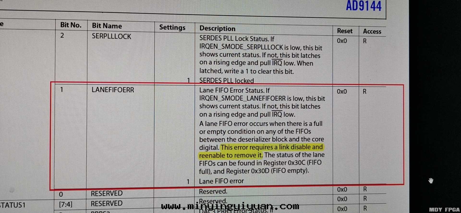 【問(wèn)題(tí)11.39】請問(wèn)9144用(yòng)的(de)是(shì)mose0,配置完後(hòu),CGS可(kě)以(yǐ)过(guò),可(kě)以(yǐ)读(dú)到(dào)寄存器470是(shì)FF,8个(gè)lane都收(shōu)到(dào)了(le)k28.5,但是(shì)寄存器023的(de)bit1一(yī)直(zhí)在(zài)01之間(jiān)不(bù)停的(de)跳動(dòng),代(dài)表(biǎo)FIFO的(de)读(dú)写一(yī)直(zhí)有(yǒu)錯誤,查看(kàn)30c和(hé)30d也(yě)能(néng)看(kàn)到(dào)錯誤标(biāo)記(jì),此(cǐ)时(shí)發(fà)送sysref的(de)話(huà),ILAS也(yě)能(néng)过(guò),但是(shì)470,471,472,473都在(zài)不(bù)停的(de)跳動(dòng),sync标(biāo)記(jì)也(yě)是(shì)忽高(gāo)忽低,此(cǐ)时(shí)鍊(liàn)路(lù)不(bù)稳定(dìng),給(gěi)tx核送數據(jù),在(zài)頻谱儀上(shàng)能(néng)看(kàn)到(dào)9144的(de)輸出(chū),但是(shì)因(yīn)为(wèi)鍊(liàn)路(lù)不(bù)稳定(dìng),輸出(chū)会(huì)不(bù)停的(de)閃爍,理論上(shàng)講,鍊(liàn)路(lù)稳定(dìng)的(de)話(huà),470.471.472.473都應(yìng)該回(huí)读(dú)FF才对(duì),我(wǒ)想(xiǎng)請教一(yī)下(xià),是(shì)什麼(me)導致(zhì)了(le)9144配置完後(hòu)fifo的(de)读(dú)写标(biāo)記(jì)一(yī)直(zhí)報錯呢?也(yě)就(jiù)是(shì)寄存器023的(de)bit 1